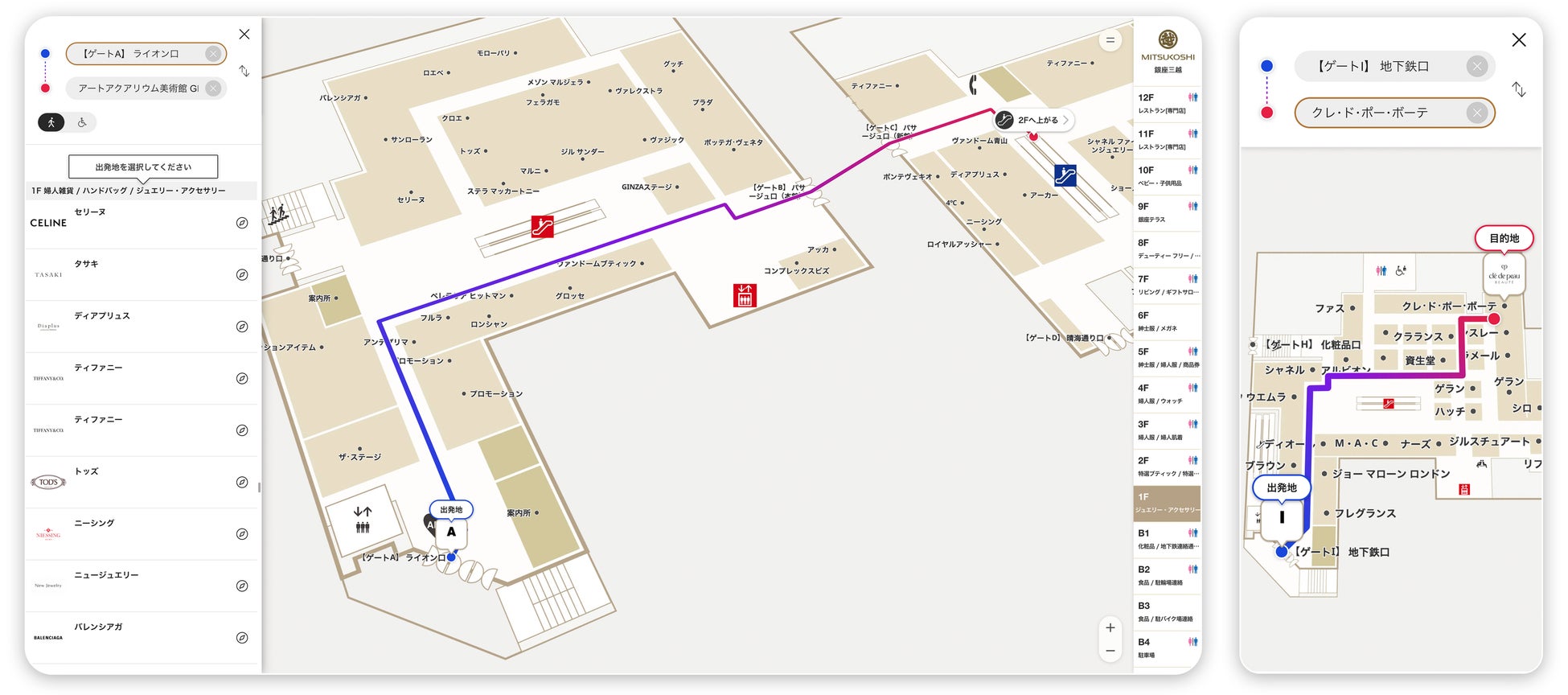 銀座三越は地下3階から12階とフロアが多く、2つの棟に分かれた館内構造となっています。そのため、従来の紙マップやPDFでは、マップの拡大縮小や店舗詳細の確認が難しく、口頭での経路案内が困難でした。