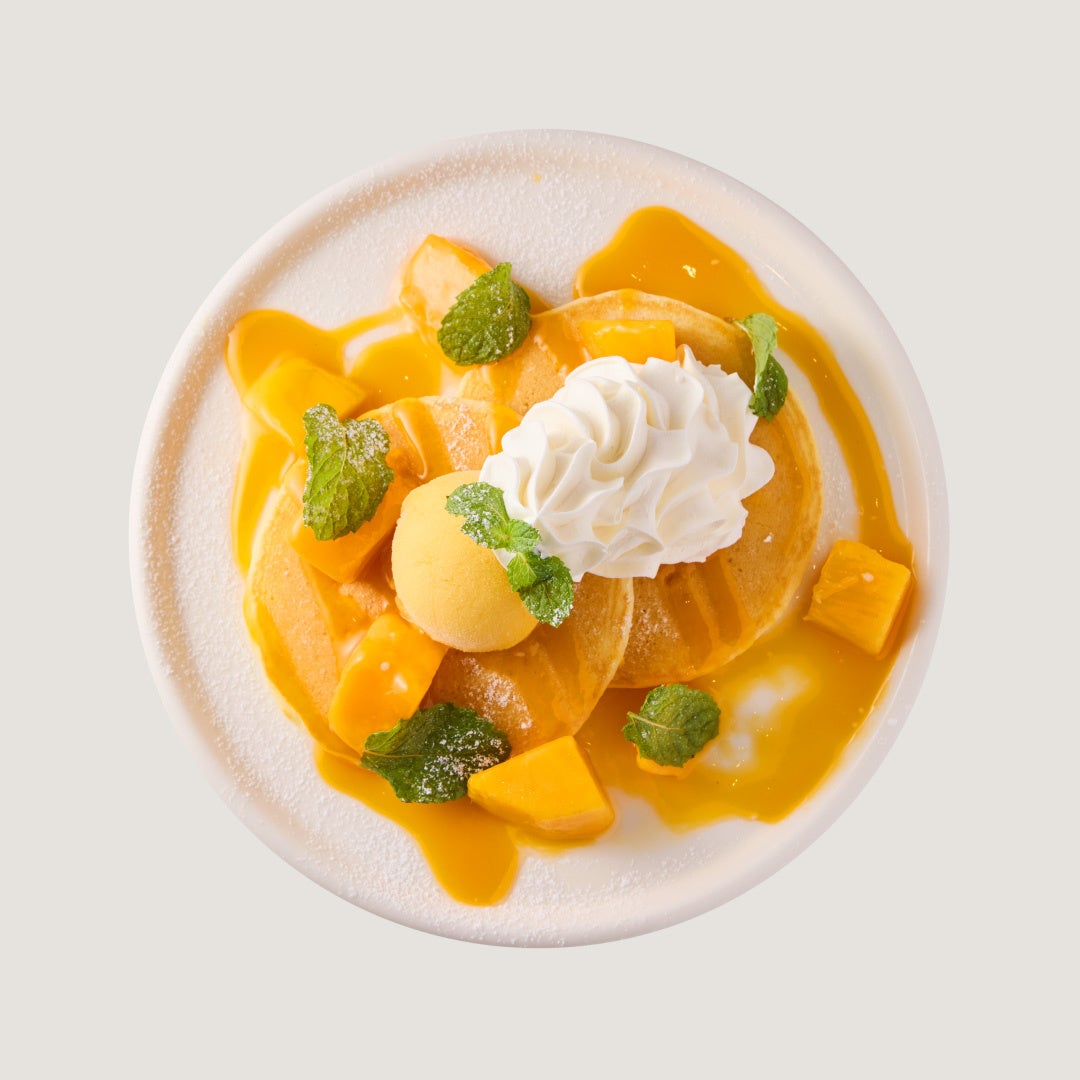 濃厚なマンゴーシャーベットにゴロゴロ果肉とホイップをふんわり重ねた贅沢なパンケーキ。甘酸っぱいソースが全体をまとめ、フルーティで軽やかな後味に。冬のひとり時間を彩る、南国気分のトロピカルデザートです。