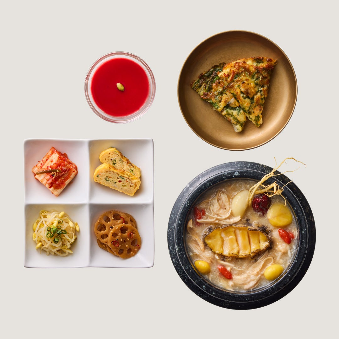 まるまる一匹の蒸しアワビに、高麗人参やクコの実、にんにく、栗、ナツメ、ぎんなんなど10種以上の韓方(ハンバン/韓国式漢方)素材を合わせた、滋養豊かな白粥。体の芯からじんわり温まり、心と身体を整えてくれる冬のごちそう薬膳です。