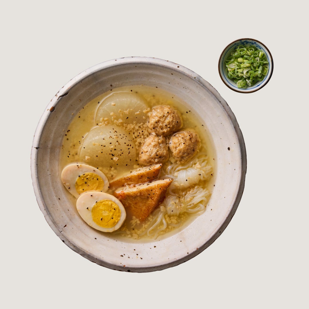 鶏白湯スープで煮込んだ具材に熱々の背脂をじゅわっとかけて仕上げる、濃厚で背徳感のある冬限定おでん。出汁をまとった具材は一層コク深く、最後まで冷めずに熱々のまま味わえます。〆の麺(+¥200)を入れれば、至福の鶏白湯ラーメンとしても楽しめます。