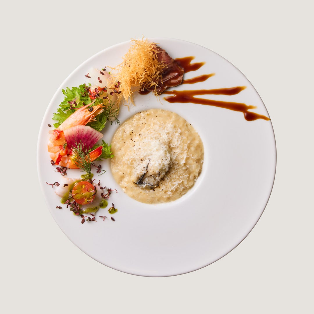 冷製ローストビーフ、海老のカルパッチョ、トマトとタコのサラダ仕立ての前菜3種とメインがひと皿で楽しめる、満足度の高い一皿。メインのリゾットは、牡蠣の出汁で炊き上げた濃厚な味わいに、チーズとトリュフの深いコクを重ねた冬限定の豪華仕立てです。
