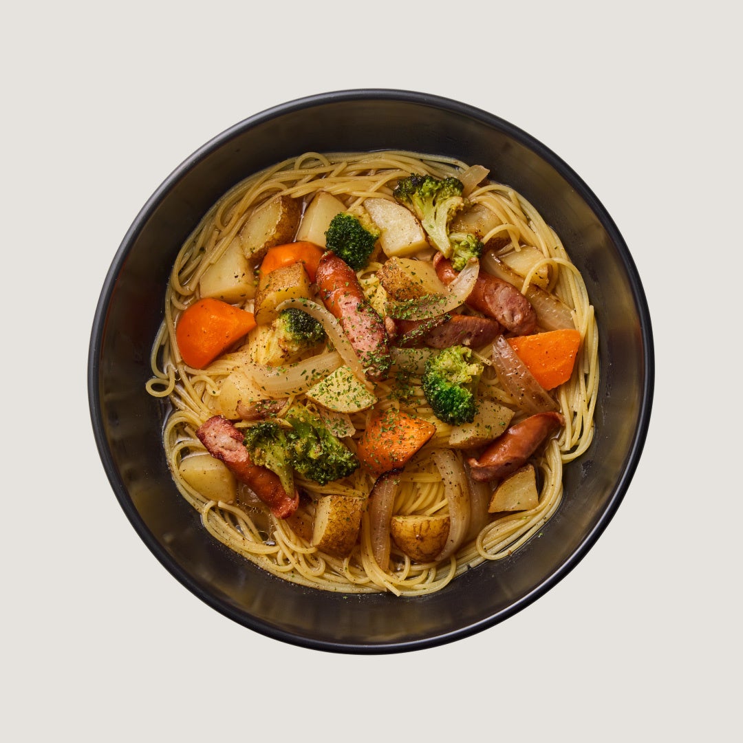 野菜と肉をふんだんに使った、お店のどのメニューよりも具だくさんなポトフをスープスパゲッティに。にんじんやキャベツの甘みがスープに溶け込み、太めのスパゲッティに絡んで滋味深く、ボリュームもたっぷり。寒い日にふさわしい、ほっとする冬の新定番スパゲッティです。