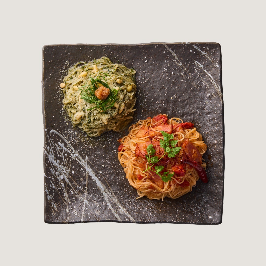 香川の唐辛子・本鷹をきかせたピリ辛アラビアータと、大葉が香る爽やかなジェノベーゼを合わせた、彩り豊かなそうめん。赤と緑のコントラストが映えるクリスマスカラーで、冬の渋谷にぴったりです。ひとりでも気兼ねなく楽しめるので、ご褒美メニューとしてもおすすめです。