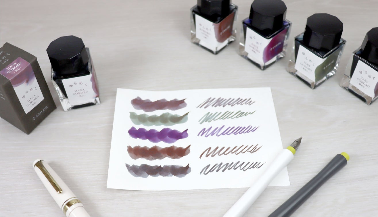 様々な紙に書いた時の違いや、時間の経過によって異なる表情が出ますので、万年筆用インクとしてだけでなく、つけペンやガラスペンなどを使って幅広く「ゆらめく」ような色の変化が楽しめる新しいインクです。