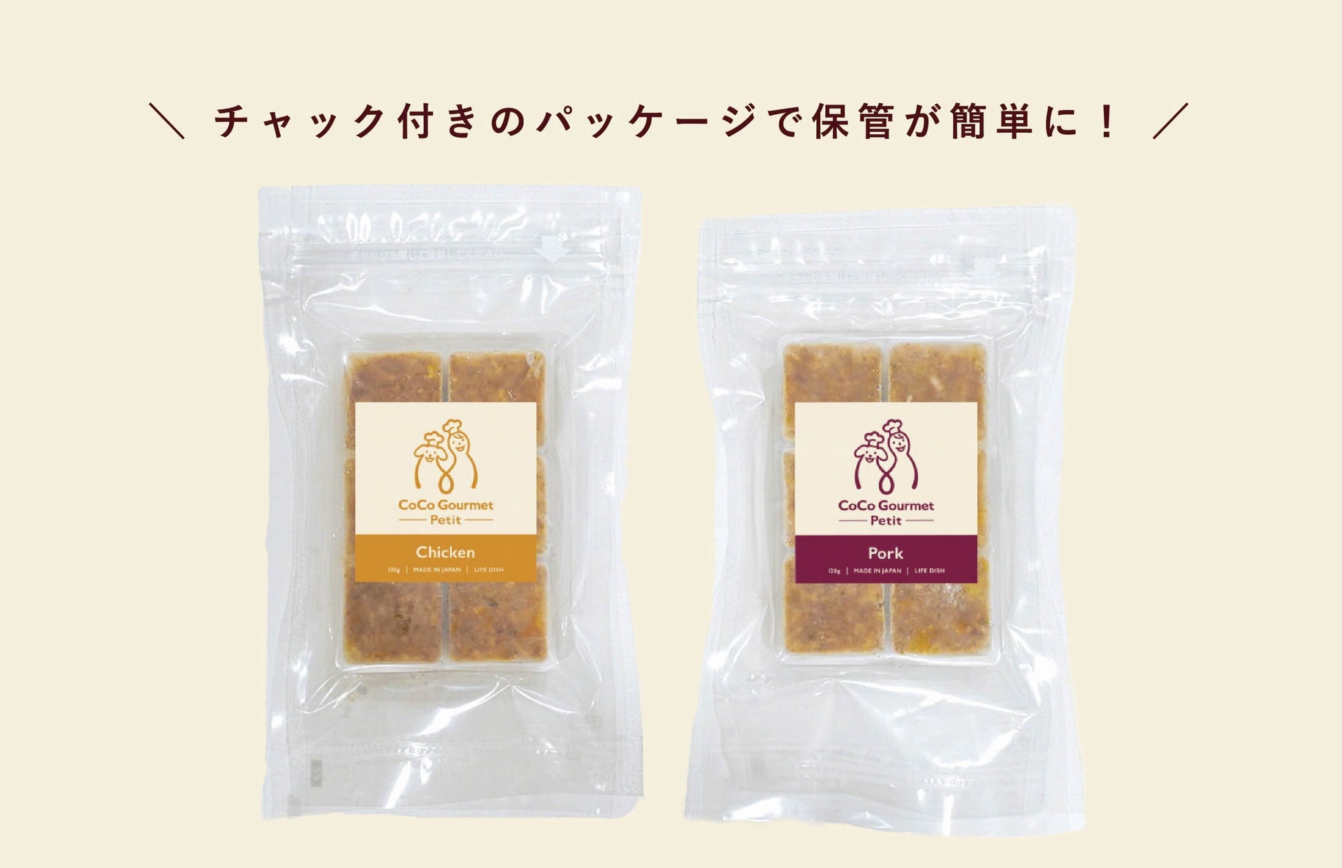 ココグルメプチは、ココグルメの美味しさ、安全性はそのままに、1キューブ約20g × 6個(120g)の便利な小分け包装にしました。ワンちゃんの体格や使用用途によって、冷凍した状態で必要な分を「プチっ」と押して解凍するだけで手軽に与えることができます。メニューは人気のチキンとポークの2種をご用意しています。