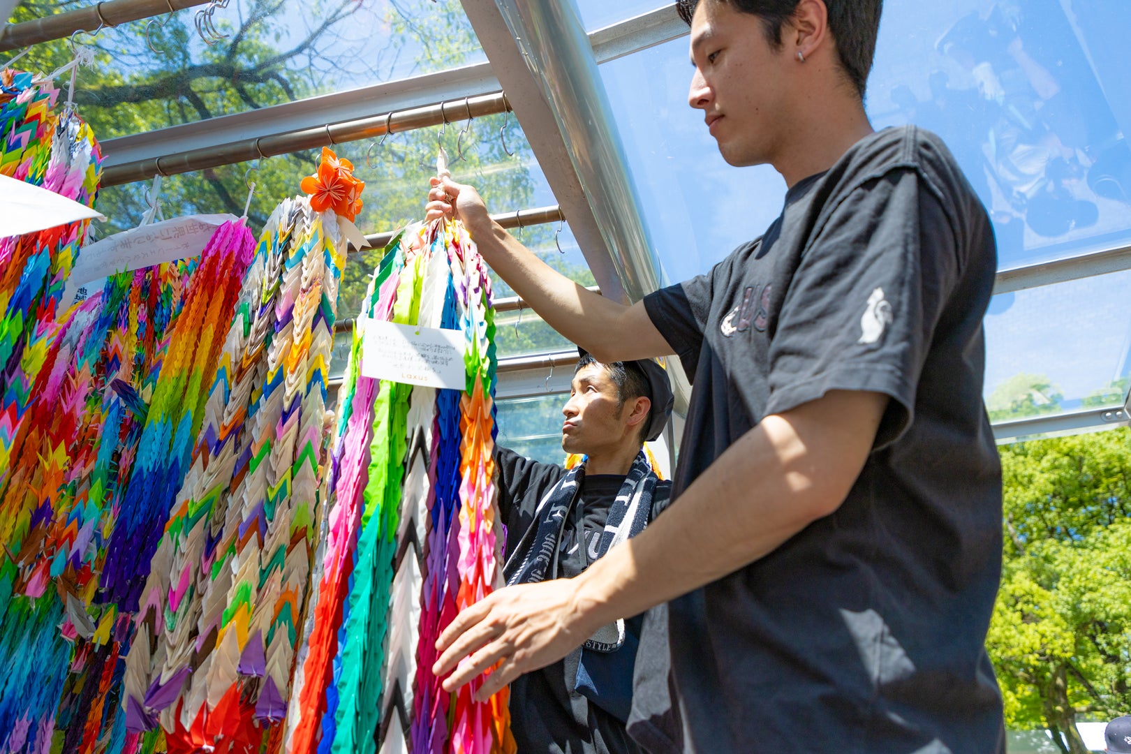 これらの千羽鶴を、8月6日の平和記念式典を前に、スタッフ一同の手で平和記念公園に寄贈いたしました。千羽鶴は「原爆の子の像」に飾られ訪れる人々に平和のメッセージを伝え続けます。