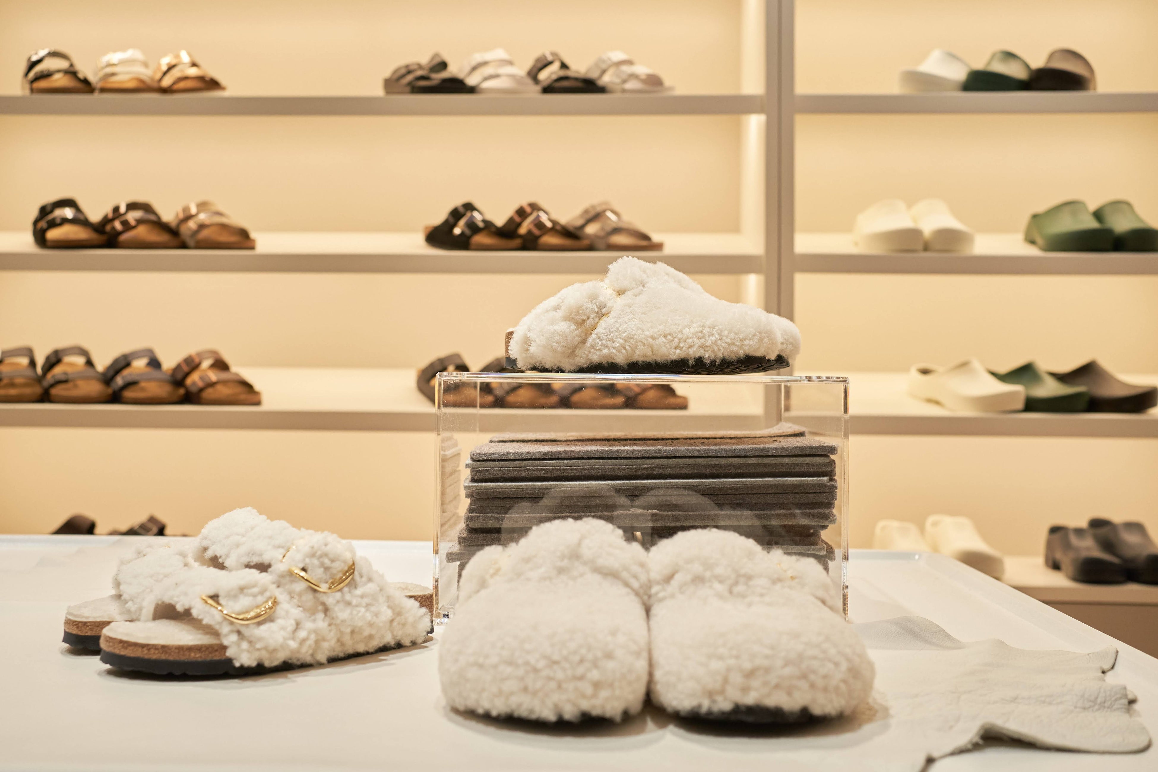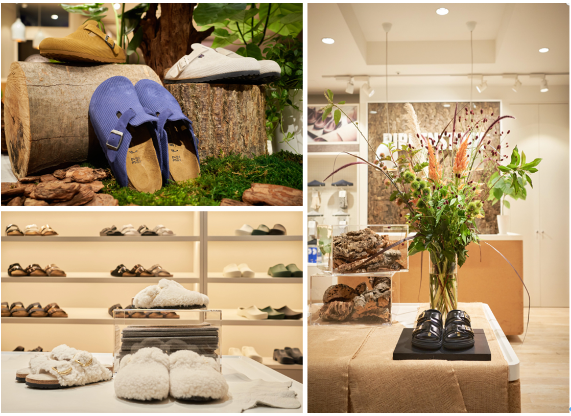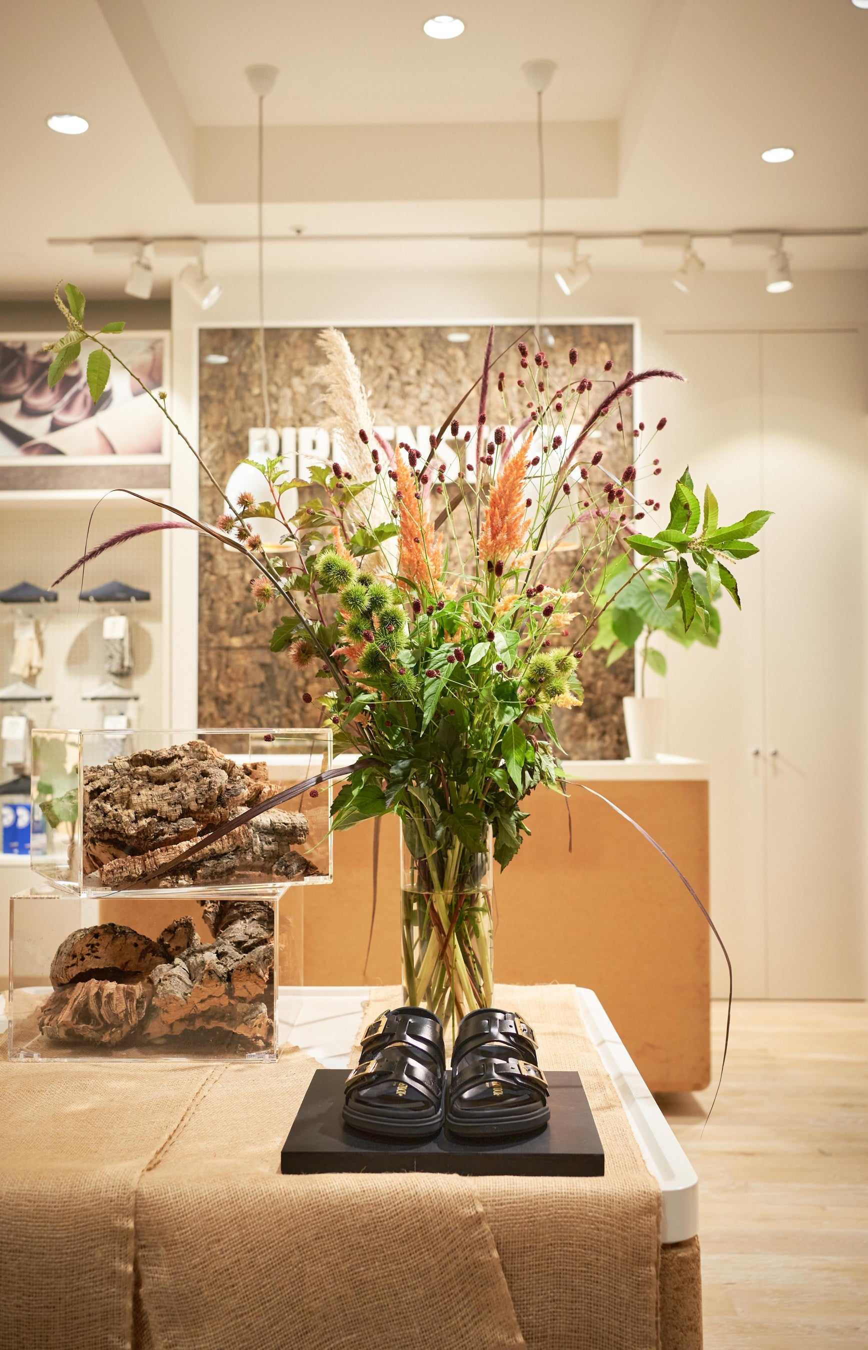 新しいBIRKENSTOCK アミュプラザ博多の内装には、BIRKENSTOCKらしい自然からのインスピレーションを取り入れたディスプレイを採⽤し、ブランドの世界観を体験できる空間でショッピングをお楽しみいただけます。