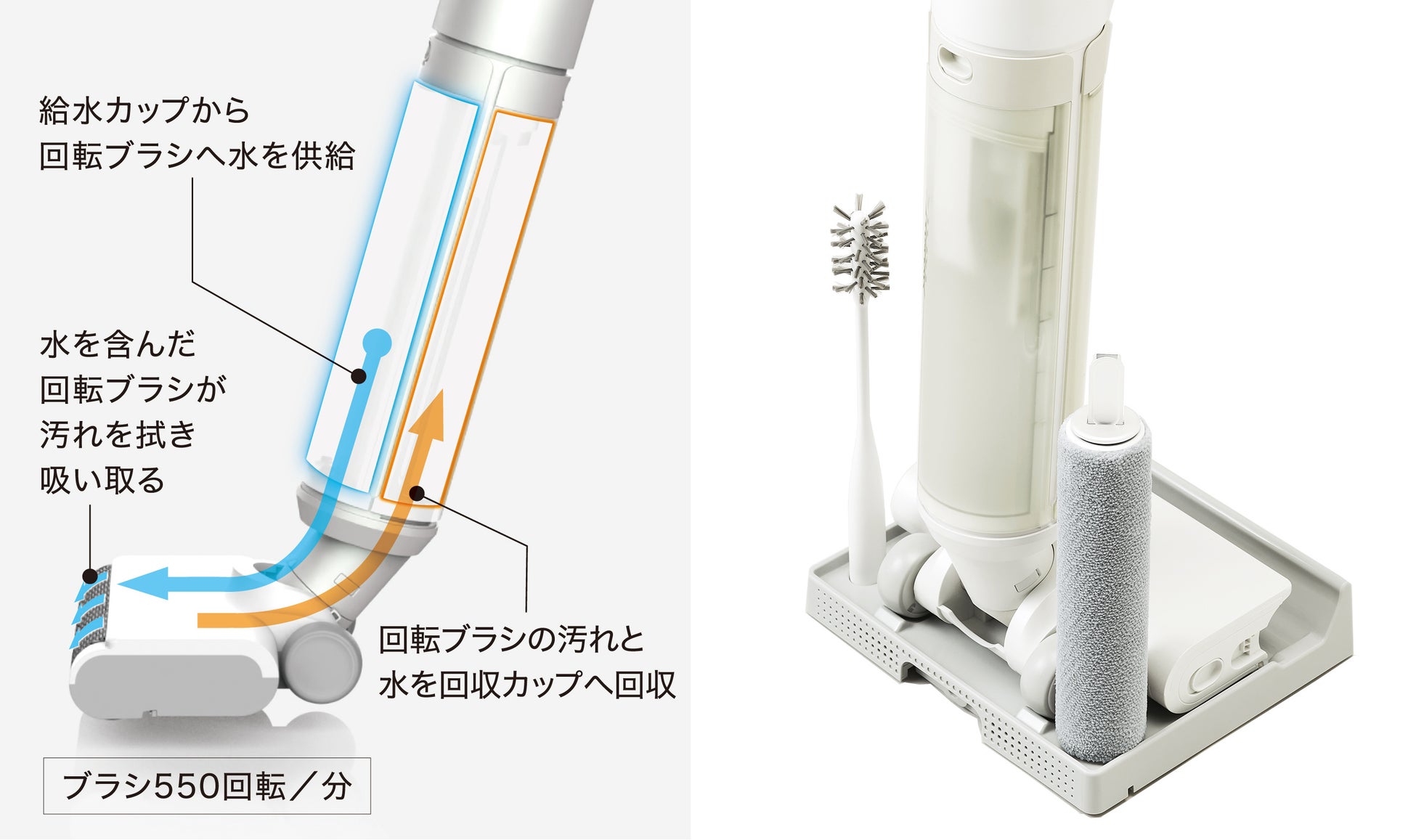 掃除機をかけるのと同じ要領で本体を押し引きするだけで、回転ブラシが床を拭き上げるのと同時に強い吸引力でゴミや汚れた水を吸い上げます。回転ブラシへは給水カップからきれいな水を供給するので、常に清潔なブラシで掃除することができます。フローリングなどの水拭き可能な床材に使用でき、日常的に出るホコリや髪の毛の他、お子様の食べこぼしや落として割れた生卵など、固形物も吸引することができます。給水カップには60℃までのお湯や専用洗剤を入れられるので、皮脂汚れのような水だけでは落ちにくい汚れにも対応します。