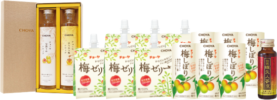 紀州産の完熟南高梅を使用した「完熟うめシロップ」と「はちみつ梅シロップ」は、お水や炭酸水で割ると梅ドリンクに、ヨーグルトにかけても美味しくお召し上がりいただけます。ぷるぷる食感でお子様に大人気の「梅ゼリー」や、クエン酸が1本に660㎎入っている濃厚で甘酸っぱい梅ドリンク「梅しぼり」、高麗人参と12種類の草根木皮を贅沢に使用した「特撰蝶矢人参液」が入ったご家族みんなでお楽しみいただけるセットです。