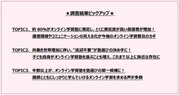 - Topic1.約80%がオンライン学習塾に満足し、とくに満足度が高い保護者が増加!通信環境やコミュニケーションの見える化が今後のオンライン学習普及のカギ