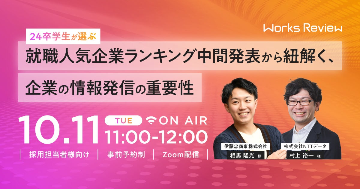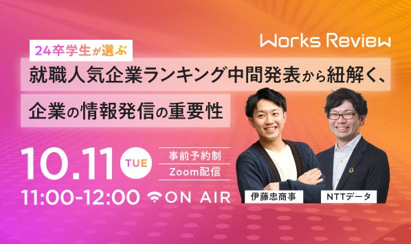 株式会社ワークス・ジャパン(本社:東京都千代田区、代表取締役:清水信一郎、以下 ワークス・ジャパン)は、2022年10月11日(火)に、採用業務に従事する部門のご担当者様を対象にしたオンラインセミナー「24卒学生が選ぶ就職人気企業ランキング中間発表から紐解く、企業の情報発信の重要性」を開催します。参加無料、事前申込制、ZOOMで配信します。