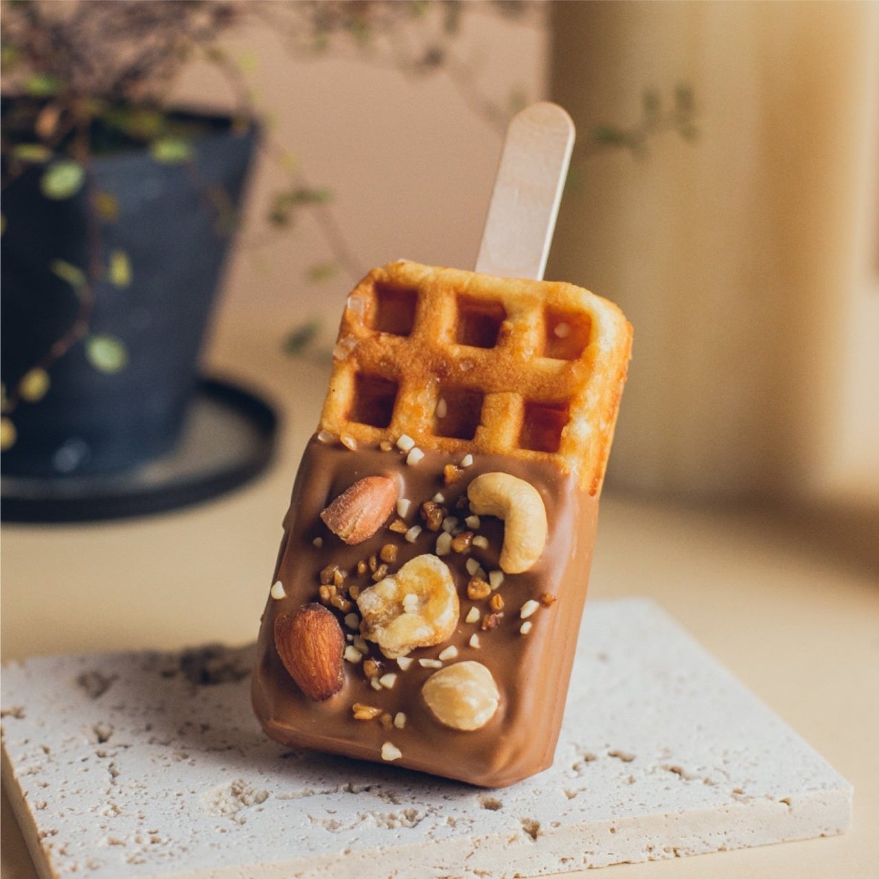 可愛いビジュアルと食べ応えにこだわり、ワッフル生地をギュッと詰めて焼き上げています。このひと手間が、kyocafe chachaの譲れないこだわりです。