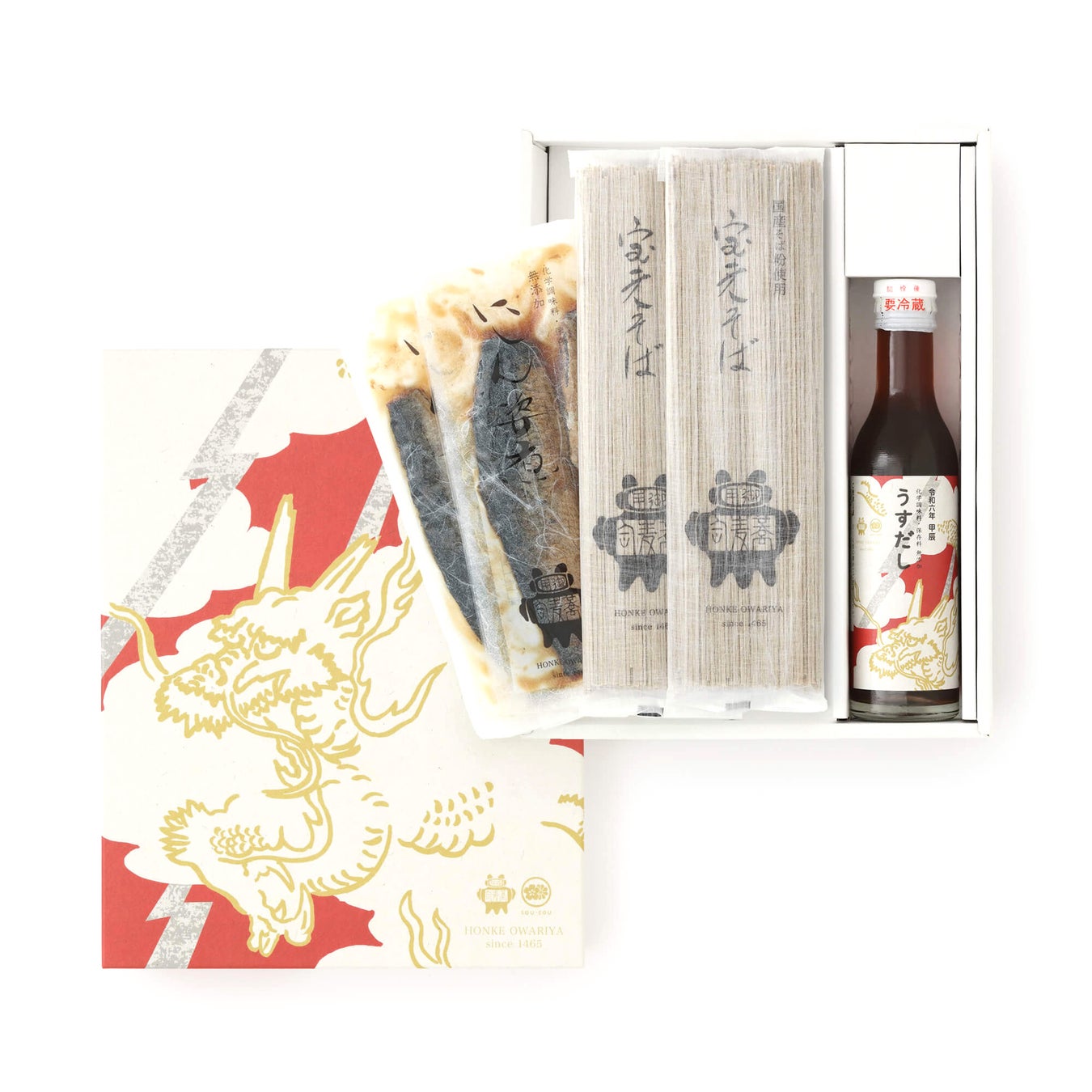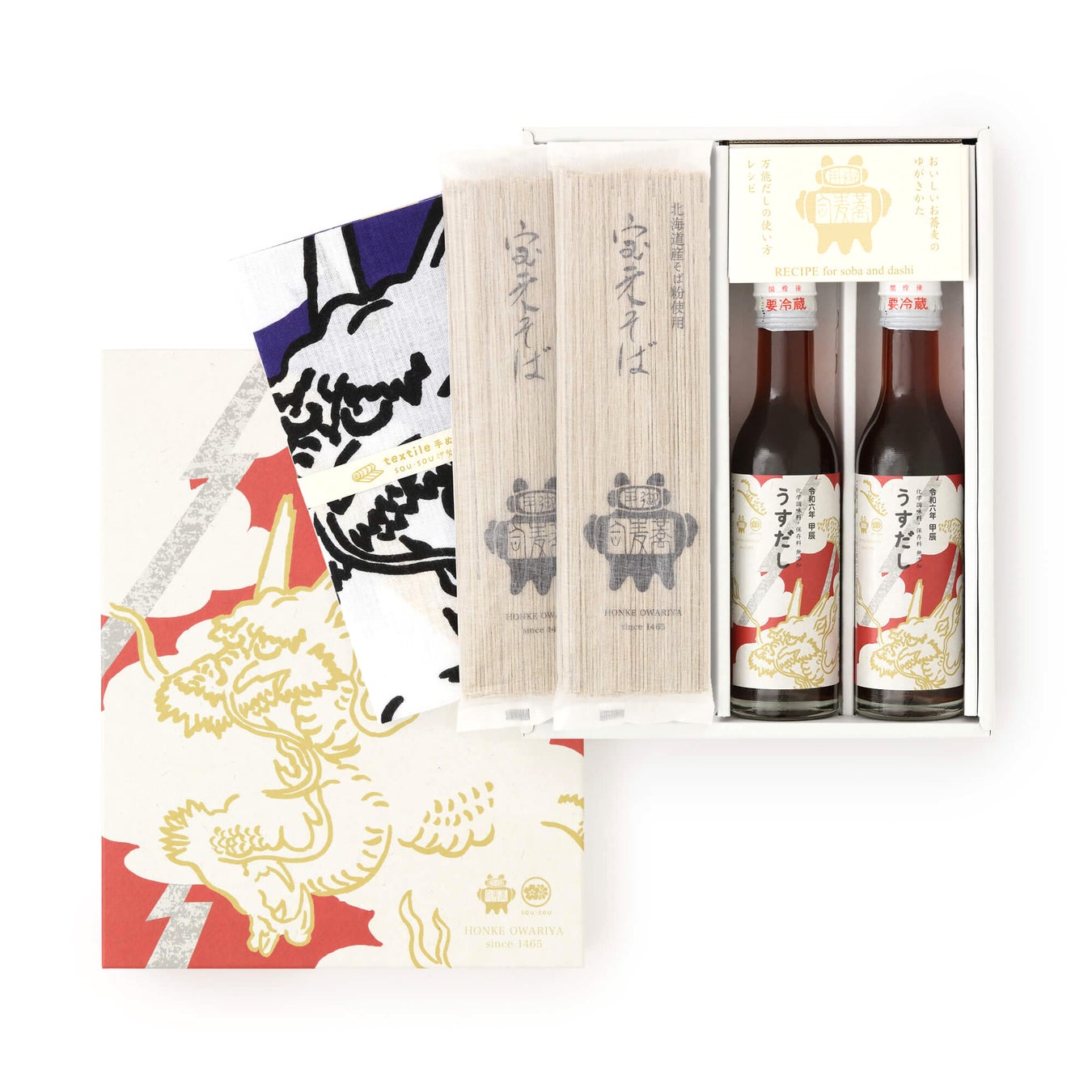 内容量:そば4袋 だし2本 手ぬぐい1枚