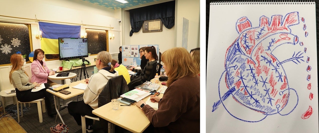 アイディアヒューマンサポートサービスは、全心連ウクライナ「心のケア」交流センター(通称:渋谷ひまわり)とともに2024年1月から開催してきたアートセラピー講座「究極のアートセラピー アートセラピーwithウクライナ」において、ウクライナ避難民の方々の心のケアを行って参りました。アイディアヒューマンサポートサービスの心理カウンセラーの養成機関であるアカデミーでは、プロフェッショナル心理カウンセラーや、プロフェッショナル心理カウンセラー資格取得をめざす人を対象に本講座を開講し、心理の専門家としてアートセラピーを深めると同時に、ウクライナ避難民の方々にとっては日本人との交流にもなることも意図します。3月からは、書道を通じたアートセラピープログラム「ShoDoアートセラピー」を提供し、書道の所作を通じて心を落ち着かせ、文字を書いたり、水墨画を描いたりすることで、緊張や怒りの感情などからくる力みを解放するなど、ウクライナ避難民の方々のセルフケアのための試みを行ったところです。