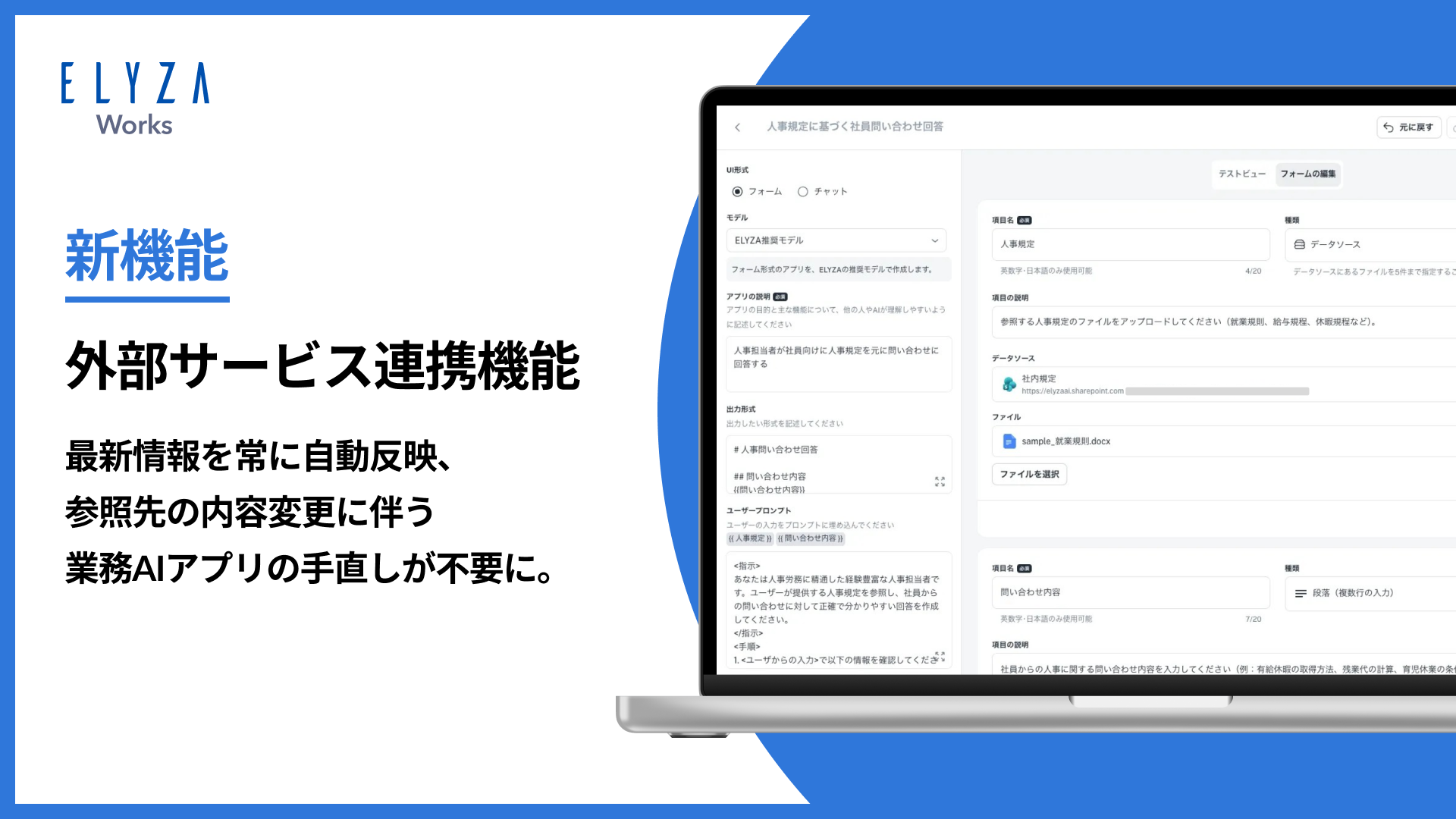 株式会社ELYZAは、法人向け生成AI活用ツール「ELYZA Works」において、クラウドストレージなどの外部サービスと連携し、その最新情報を業務AIアプリに自動反映させる新機能の提供を開始しました。まずはMicrosoft SharePointに対応し、企業が日常的に利用しているMicrosoft SharePoint上のファイルの最新情報を業務AIアプリに自動的に反映させることが可能となり、常に最新の社内情報に基づいた業務AIアプリの運用が実現します。今後GoogleドライブやBoxなど対応サービスを拡張するとともに、全てのELYZA Worksユーザーへ提供をしていく予定です。