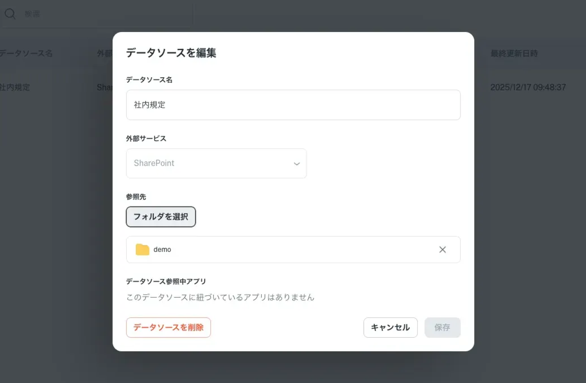 アプリ管理者は、データソースを編集し、参照可能なフォルダの範囲を制御します。