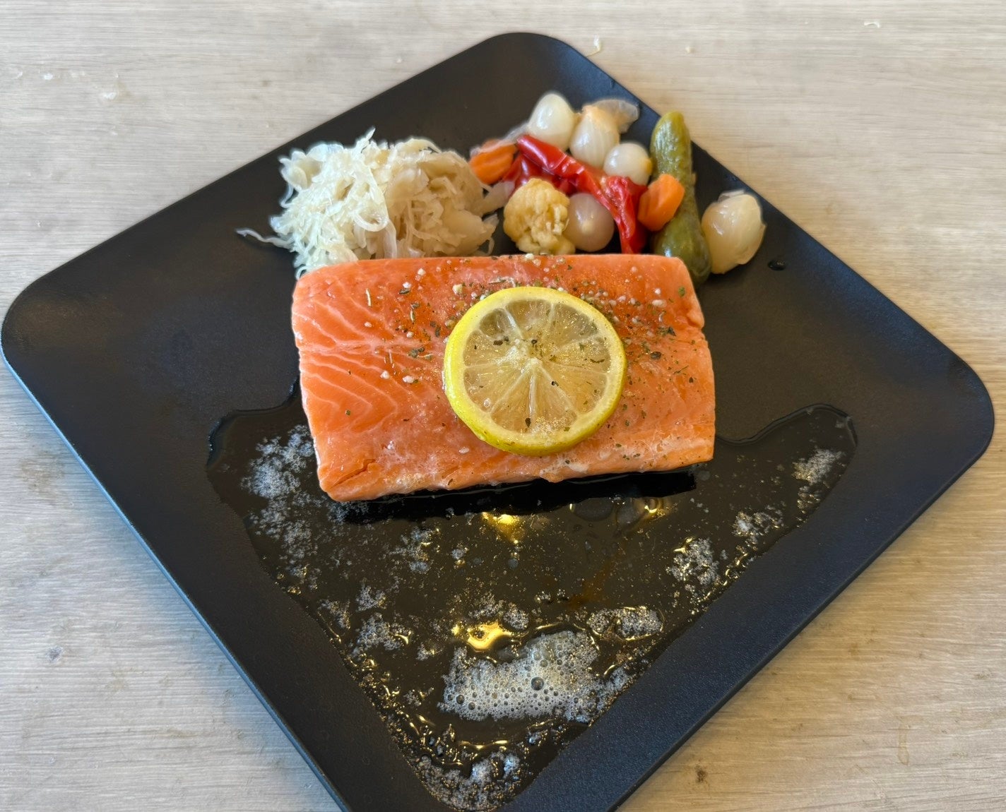 【魚料理】手作りイカ墨ガーリックシュリンプ、シュテッカルフィッシュ(魚の串焼き)、サーモンガーリックムニエル