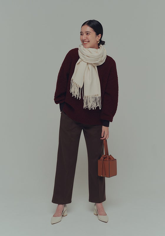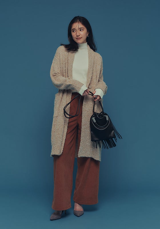 シャギーニットなど毛足の長いふんわりとした素材や、メタリックやラメといったトレンド感あるマテリアルが着こなしのスパイスに。