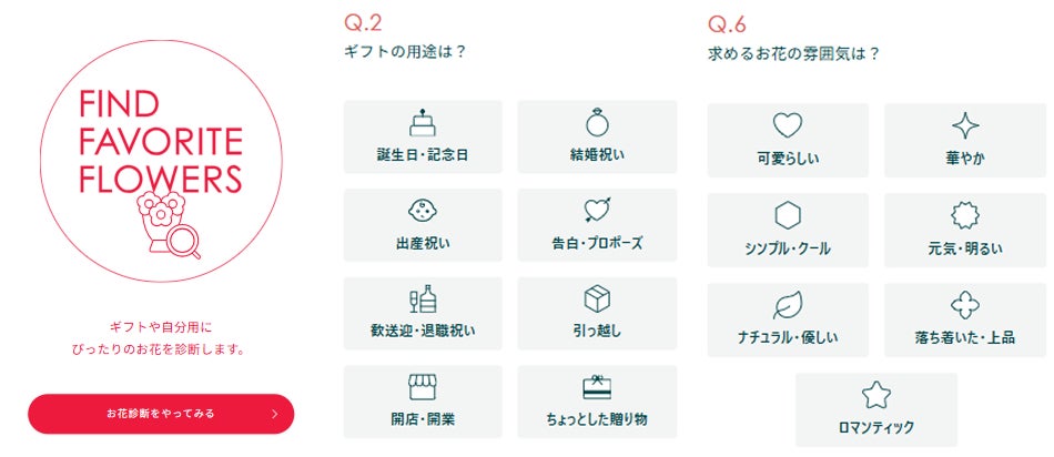 本機能では、最大7つの質問に答えるだけで、自分用・ギフト用のいずれにもぴったりのお花を提案します。