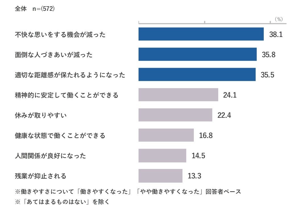 「働きやすくなった」「やや働きやすくなった」と回答した方にその理由を聞いたところ、「不快な思いをする機会が減った」が38.1%と最も高くなりました。その後に「面倒な人づきあいが減った」「適切な距離感が保たれるようになった」と続き、無理せず適度なコミュニケーションをとるといった考え方も増えてきている様子がうかがえます。