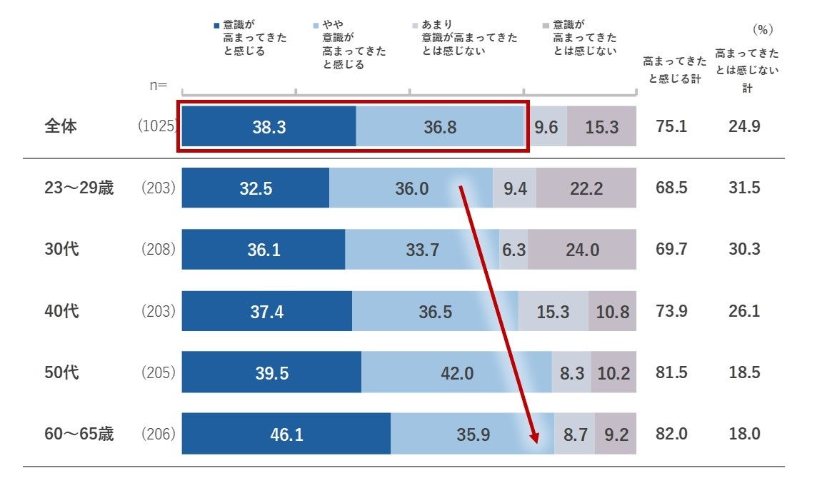ハラスメント意識の高まりについて確認したところ、全体の75.1%が「意識が高まってきたと感じる」「やや意識が高まってきたと感じる」と回答しました。
