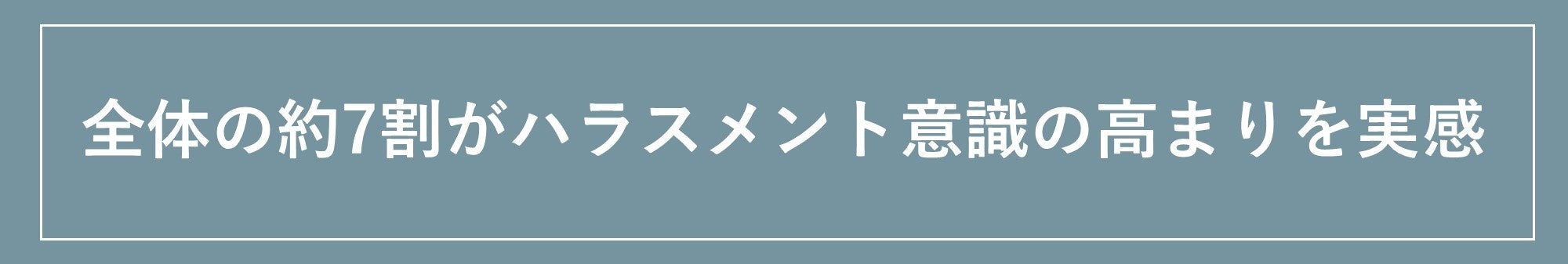 年代別に見てみると、実感値は年齢が上がるにつれて増加しています。20代は現在のハラスメントに気を付ける風潮が当たり前なのに対し、高年齢層は昔の不適切が飛び交っていた時代と比べると意識が高まってきた、そんな背景があるように見受けられます。