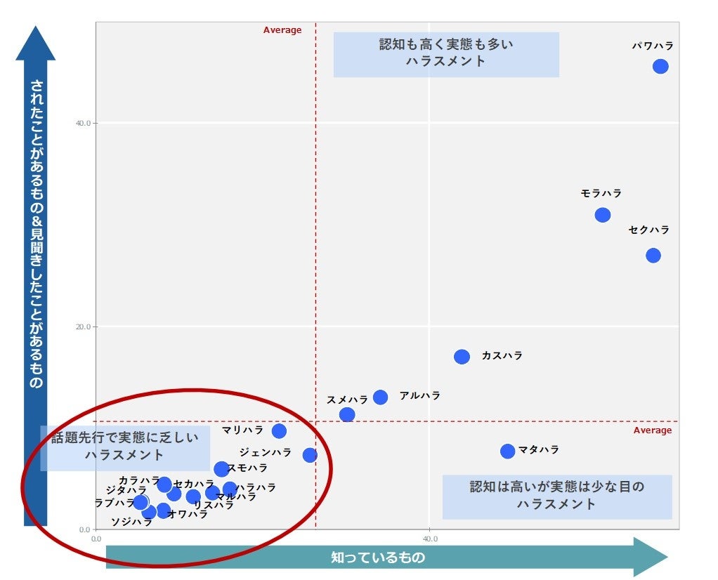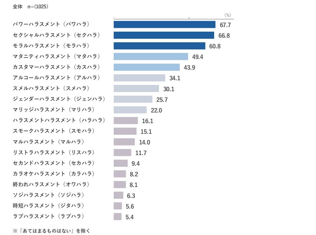 その結果、比較的昔から世の中に浸透している「パワハラ」「セクハラ」「モラハラ」が上位を占めています。