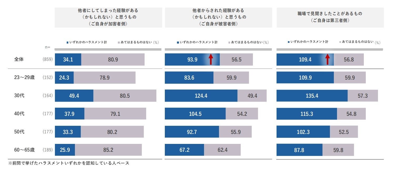 知っていると回答したハラスメントについて「他者にしてしまったもの」「他者にされたもの」「職場で見聞きしたことがあるもの」をそれぞれ聞いたところ、いずれかのハラスメントであてはまると回答した割合が「してしまったもの」より「されたもの」「見聞きしたことがあるもの」の方が多くなっています。自分ではハラスメントに該当しないと思った言動も、受け手によってはハラスメントとして捉えられている、といった受け取りかたのギャップもあるのではないでしょうか。