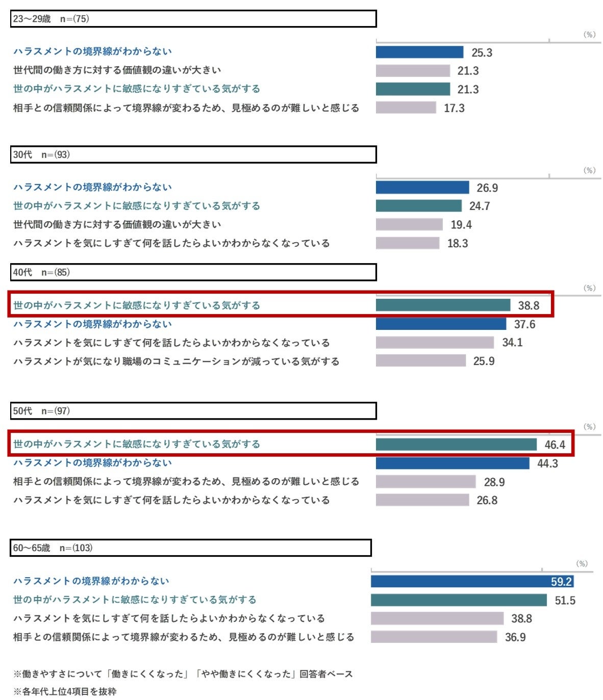 年代別に見てみると、「世の中がハラスメントに敏感になりすぎている気がする」が40代、50代でトップに。60代では「ハラスメントの境界線がわからない」が6割弱となっていて、ハラスメントが問題視される現代に適応しようとしながらも境界線に悩まれている様子がうかがえます。
