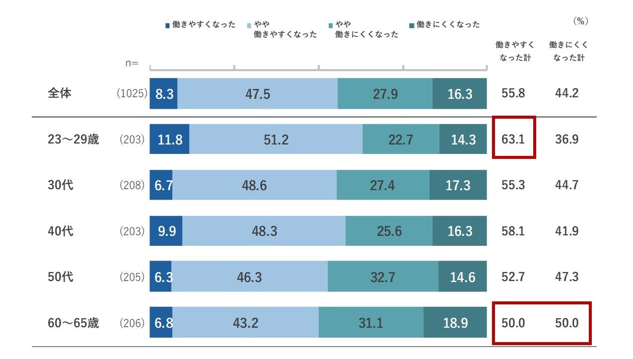 20代は63.1%が「働きやすくなった」「やや働きやすくなった」と回答しています。他の年代に比べると、最も高い結果となりました。