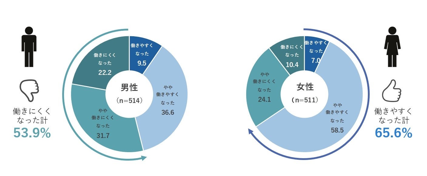 まず男女別で見てみると、男性は半数以上が「働きにくくなった」と回答したのに対し、女性は6割以上が「働きやすくなった」と回答しています。