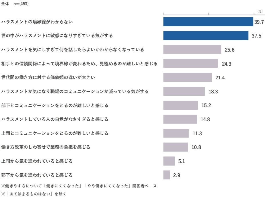 反対に「働きにくくなった」「やや働きにくくなった」と回答した方にその理由を聞いたところ、「ハラスメントの境界線がわからない」が39.7%と最も高くなっています。さらに「世の中がハラスメントに敏感になりすぎている」が37.5%と続き、何かと“○○ハラ”と結びつける現代に疑問を感じている様子もうかがえます。他にも「ハラスメントを気にしすぎて何を話したらよいかわからなくなっている」「相手によって境界線が変わるため、見極めが難しい」といった意見も多く、コミュニケーションの難しさや相手との距離の縮め方に悩まれているようです。