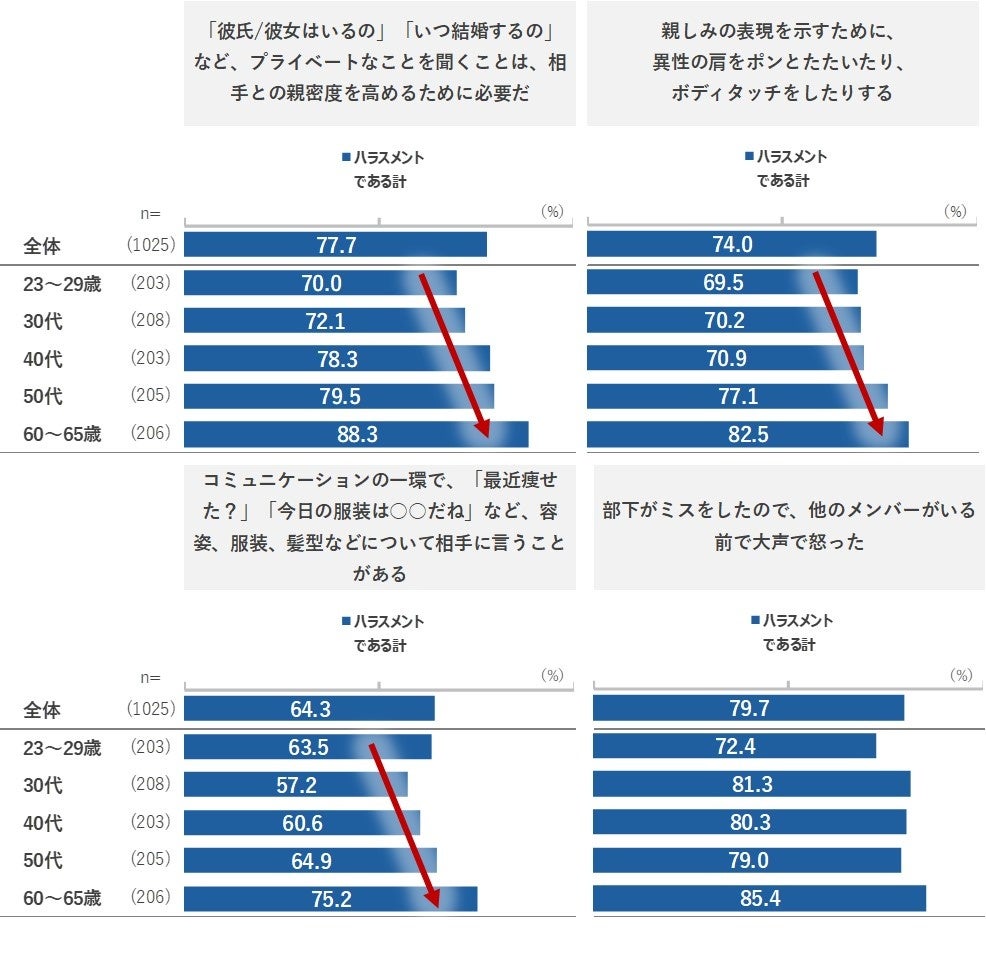 最後にいくつかの事例に対してハラスメントと思うかを聞いてみました。ほとんどの事例で、上の年代のほうがハラスメントであると回答した割合が多くなっています。上の年代が、ハラスメント意識の高まりでかなり気を付けている様子がうかがえて、ハラスメントの対象となる部下がいない立場が多いゆえか若年層はやや気を付ける意識が下がる傾向にあります。