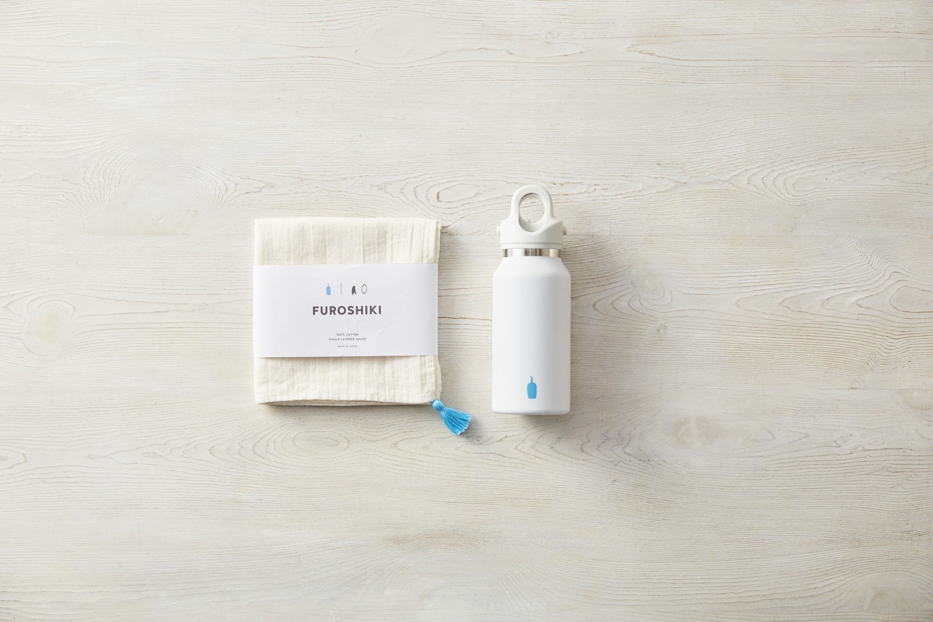 新潟県・糸魚川市(いといがわし)に自社の縫製工場をもつガーゼ服専門ファクトリーブランド「ao(アオ)」とコラボレートした、ブルーボトルコーヒーオリジナルカラーのタッセルが目を引く「ふろしき」。風合いの良いやわらかなガーゼを使用したこちらのふろしきは、いろいろなものを包み運ぶだけではなく大判のハンカチとしても、さまざまな用途に合わせてお使いいただける一枚です。
