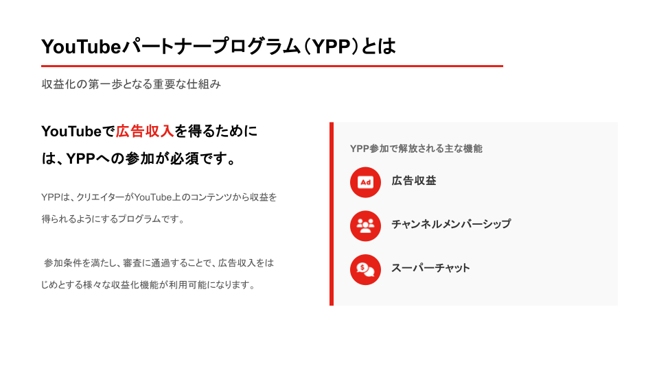 YouTubeで広告収入などを得るためには、「YouTubeパートナープログラム(YPP)」への参加が必須です。