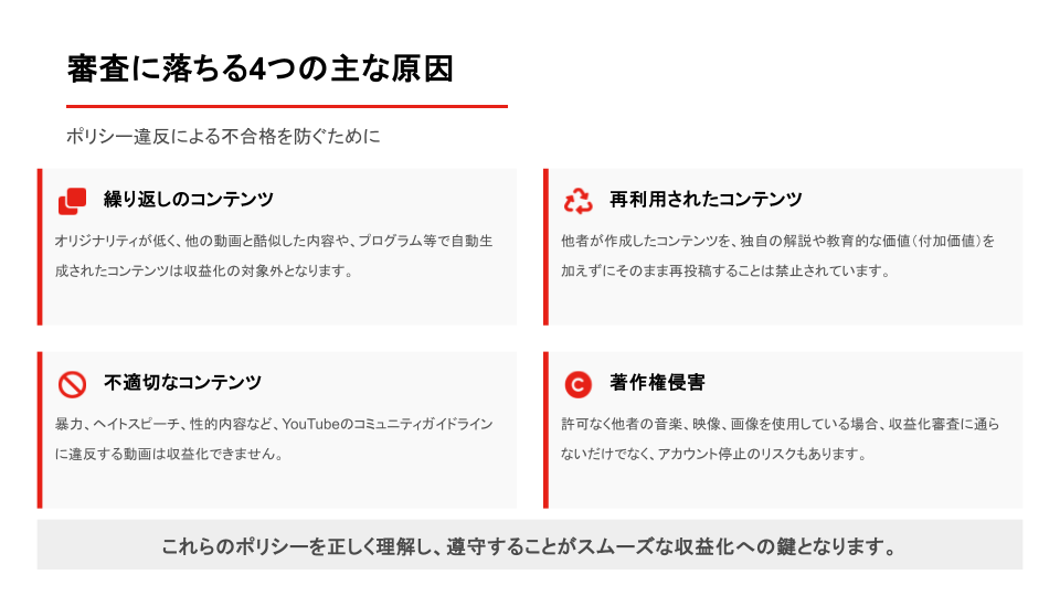 その主な原因は、YouTubeが定める「YouTubeチャンネルの収益化に関するポリシー」に違反している場合です。以下4点に注意しましょう。