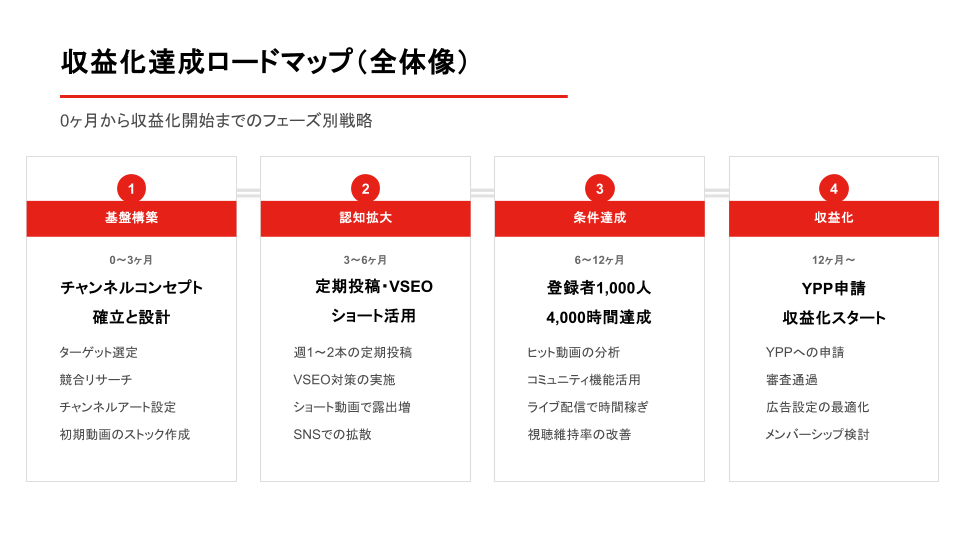 条件達成のためには、やみくもに動画を投稿するのではなく、戦略的なアプローチが求められます。