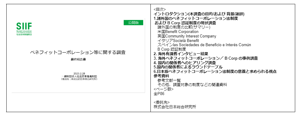 一般財団法人社会変革推進財団(理事長:大野修一 所在地:東京都港区 以下、SIIF)は、日本政府が「経済財政運営と改革の基本方針2022」において、欧米のベネフィットコーポレーション等の法制度(以下、BC法)について検討なされている現状を鑑み、日本版のベネフィットコーポレーション法制度やそれを支える民間認証のあり方に関しての提言を取りまとめることを目的として「ベネフィットコーポレーション等に関する調査(以下、本調査)」を実施し、3月28日(火)に公開いたしました。