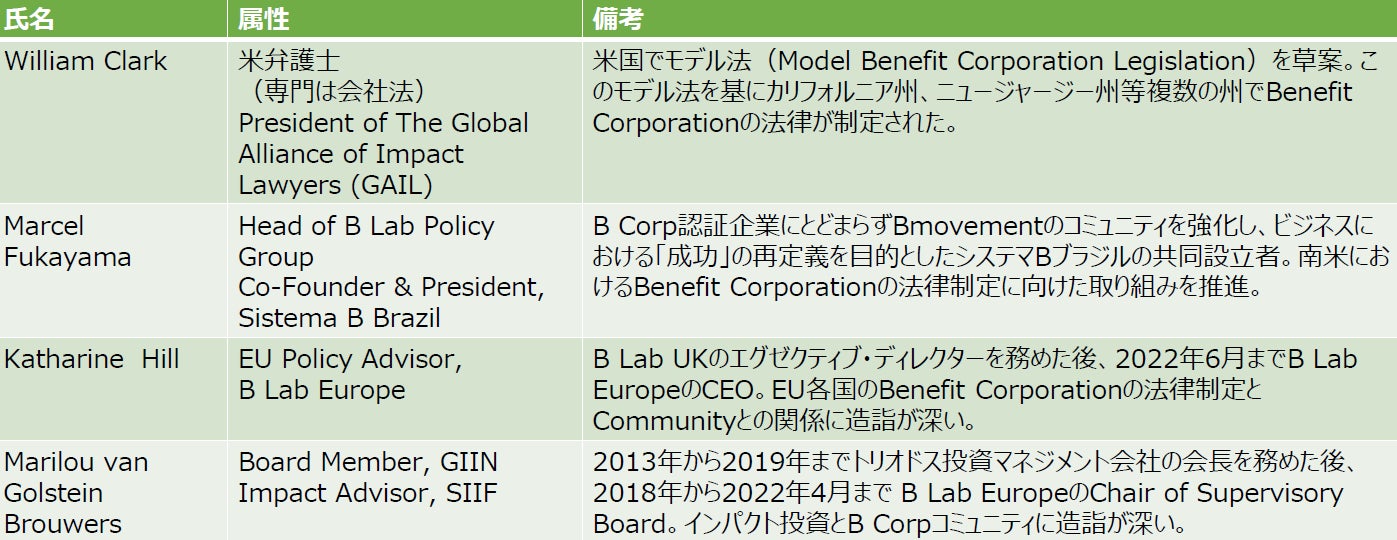 また本調査にあたり、米国でモデル法(Model Benefit Corporation Legislation)を草案したWilliam Clark氏(所属:President of The Global Alliance of Impact Lawyers, GAIL)を始めとする海外有識者・事業者17名へのインタビューと、国内事業者、アカデミアを含む30名へのヒアリング及び座談会の要点をまとめたものを記しています。