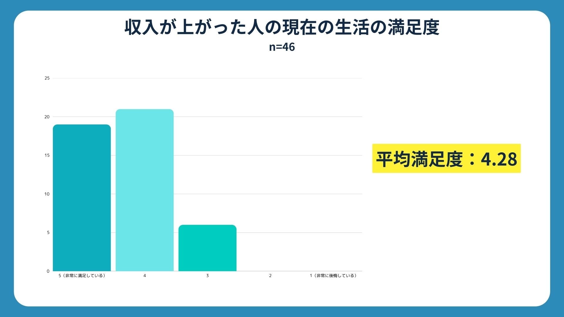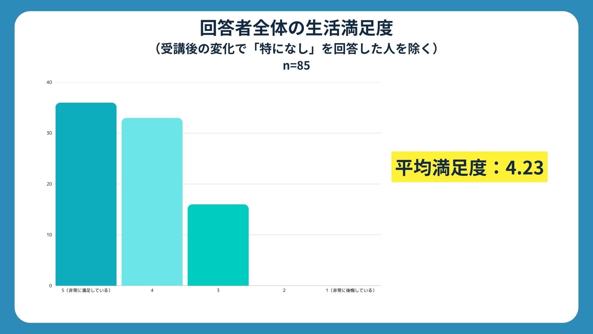 48.5%の受講生が収入の増加を経験し、全体の生活満足度も平均4.23という結果となりました。また、収入面での大きな変化がなかった層でも生活満足度は4.17と高い水準を保っています。これは、働き方の柔軟性や家族との時間確保など、収入以外の面でも受講生が価値を見出していることを表しています。実際、「育児と仕事の両立」「自分の裁量で時間が使える」といった声からも、金銭面以外での生活の質的向上が実現されていることがわかります。