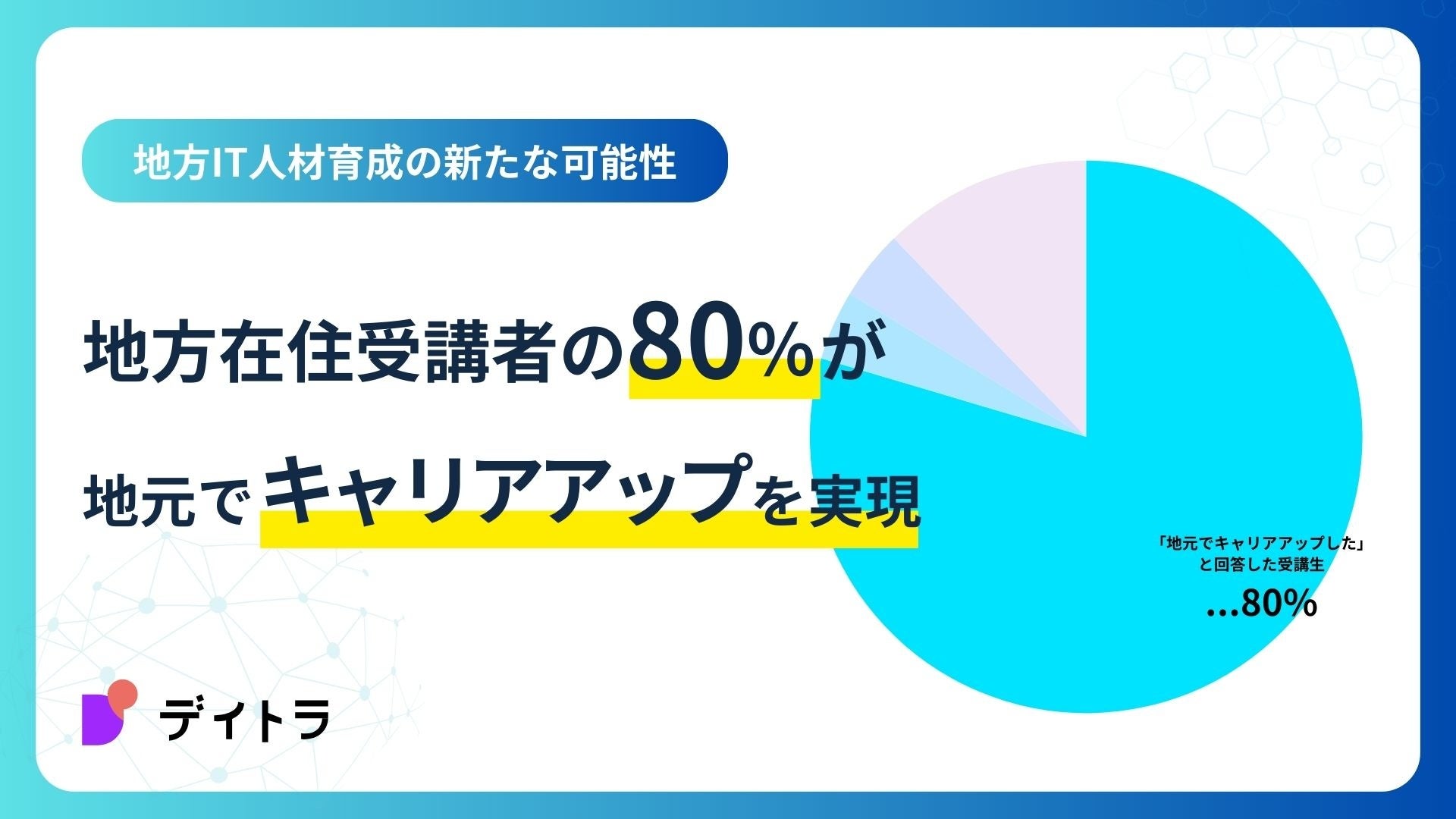 株式会社デイトラ(本社:東京都豊島区、代表取締役:大滝昇平、以下「デイトラ」)は、地方在住の受講生97名を対象とした満足度調査を実施しました。調査の結果、約80%が地元でのキャリアアップを実現し、約48%が収入増加を達成するなど、地方におけるIT人材育成の新たな可能性を示す結果が得られました。
