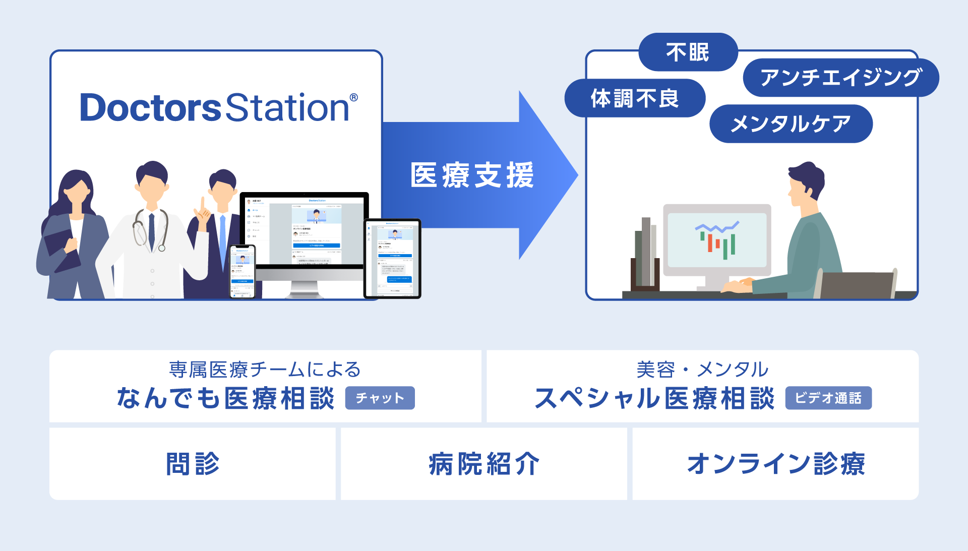 Doctors Station®は、企業、医療機関、自治体など、オンラインでの医療の支援を必要とする方々へ、デジタルヘルスサービスをまとめて提供できるプラットフォームであり、従来の健康相談やオンライン診療システムとは異なり、全診療科に対応し700名を超えるエキスパート医師を中心としたチーム医療で患者を総合的に支援するオンライン医療支援サービスです。「TRADERS Medical Support™」では、Doctors Station® をベースとしてさまざまなカスタマイズを行ったうえで、ドクターズによって提供・運営を行います。