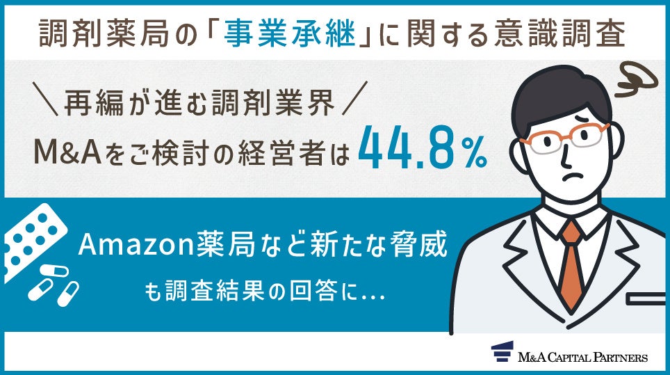 M&Aキャピタルパートナーズ株式会社(東京都千代田区・代表取締役社長 中村悟)は、薬局の経営に携わっている方105名に、調剤薬局の事業承継に関する実態調査を実施いたしましたので、お知らせいたします。