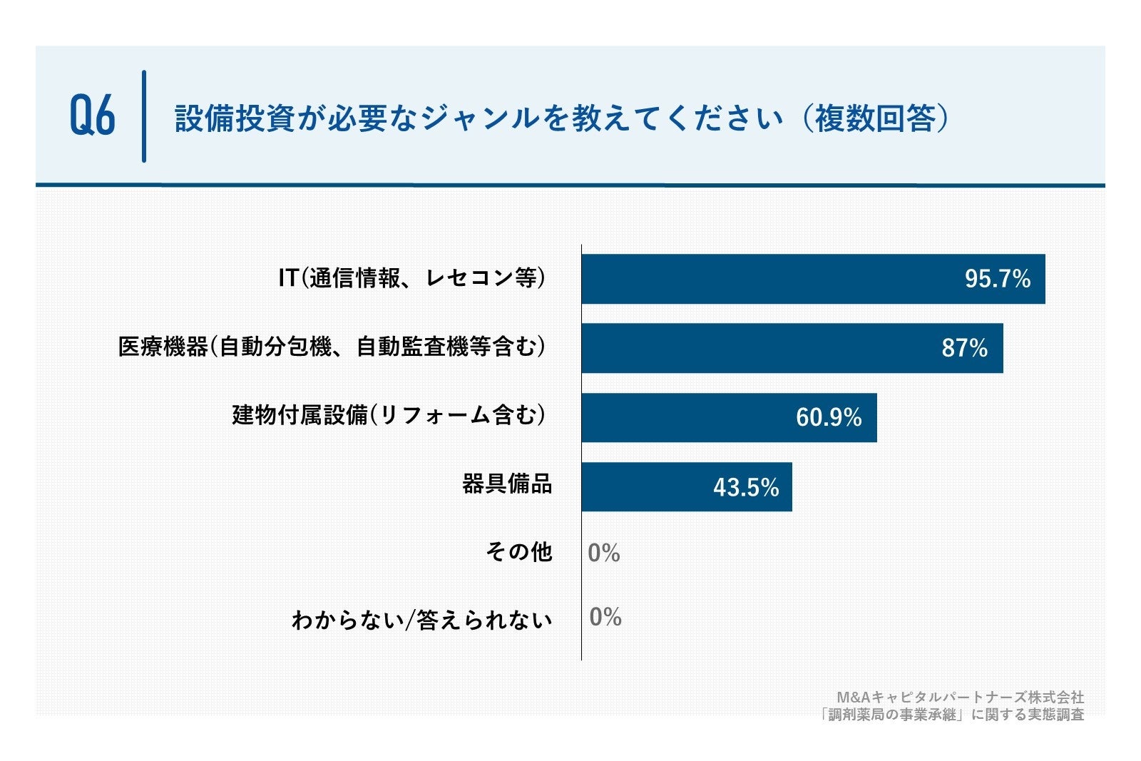 Q5で「多額の設備投資」と回答した方に、「設備投資が必要なジャンルを教えてください(複数回答)」(n=23)と質問したところ、「IT(通信情報、レセコン等)」が95.7%、「医療機器(自動分包機、自動監査機等含む)」が87.0%、「建物付属設備(リフォーム含む)」が60.9%という回答となりました。