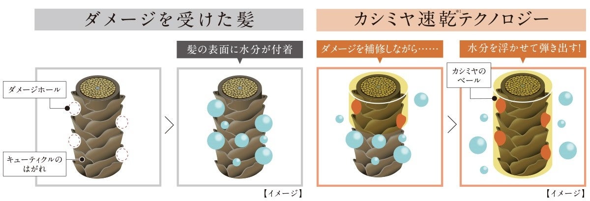 ダメージを受けた髪は、キューティクルがはがれ、内部はダメージホールと呼ばれる空洞だらけになります。この状態の髪は水分を余分に吸着しやすく、乾かすのに時間がかかります。「カシミヤ速乾*¹テクノロジー」は、カシミヤ山羊の毛から採れる成分によって髪のダメージを補修し、髪と水滴の間にカシミヤのベール*²をつくります。これにより、余分な水分を浮かせて弾き出し、速乾*¹を叶えます。使い続けることで髪に水滴がつきにくいコーティングがされていき、毎日のヘアケアを格上げします。