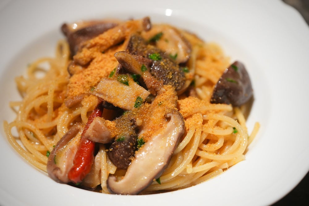 北海道七飯町にある福田農園さんから届く、王様しいたけ。料理人も驚くほどに大変肉厚でジューシーなこのしいたけを主役に据え、イタリアの伝統的なアーリオオーリオで旨味たっぷりのパスタに仕上げました。