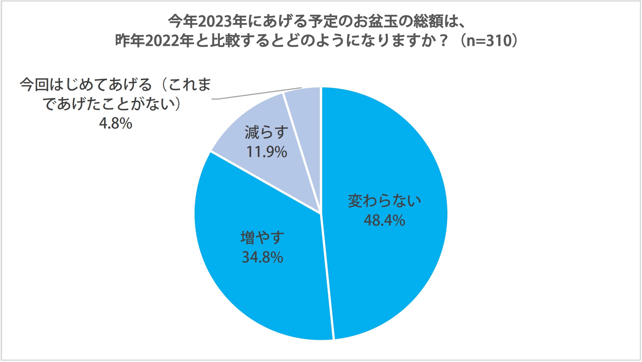 「今年2023年にあげる予定のお盆玉の総額は、昨年2022年と比較するとどのようになるか」の質問に対し回答は、「変わらない」が48.4%と最多で、次いで「増やす」が34.8%だった。