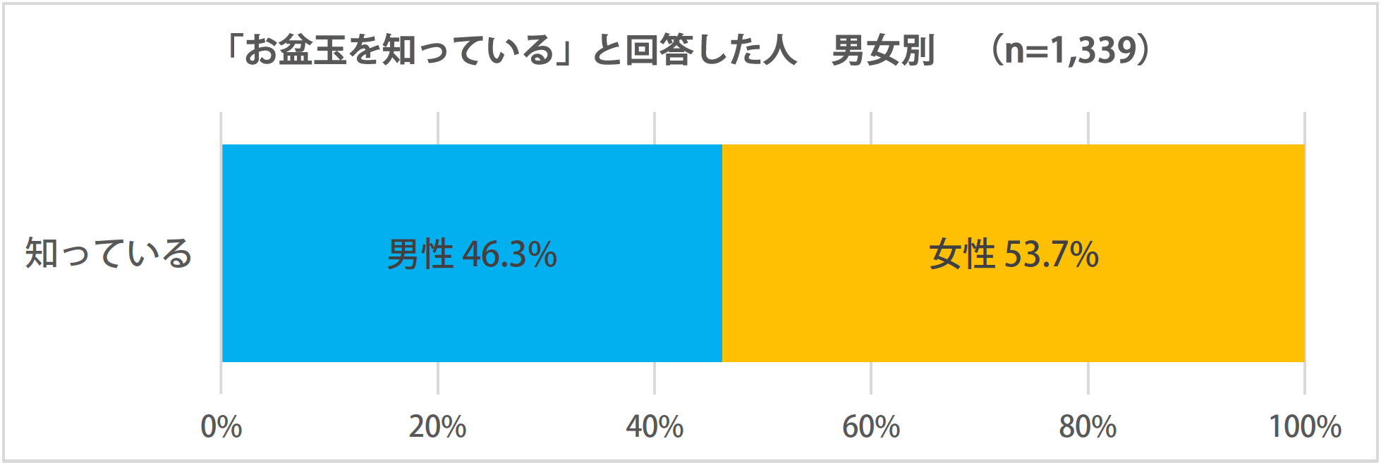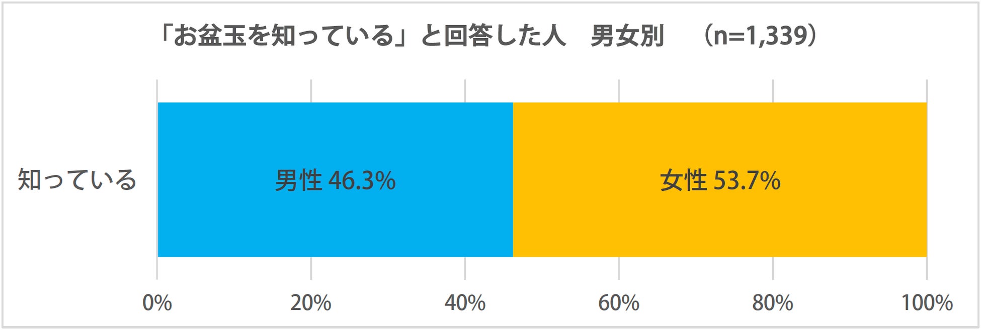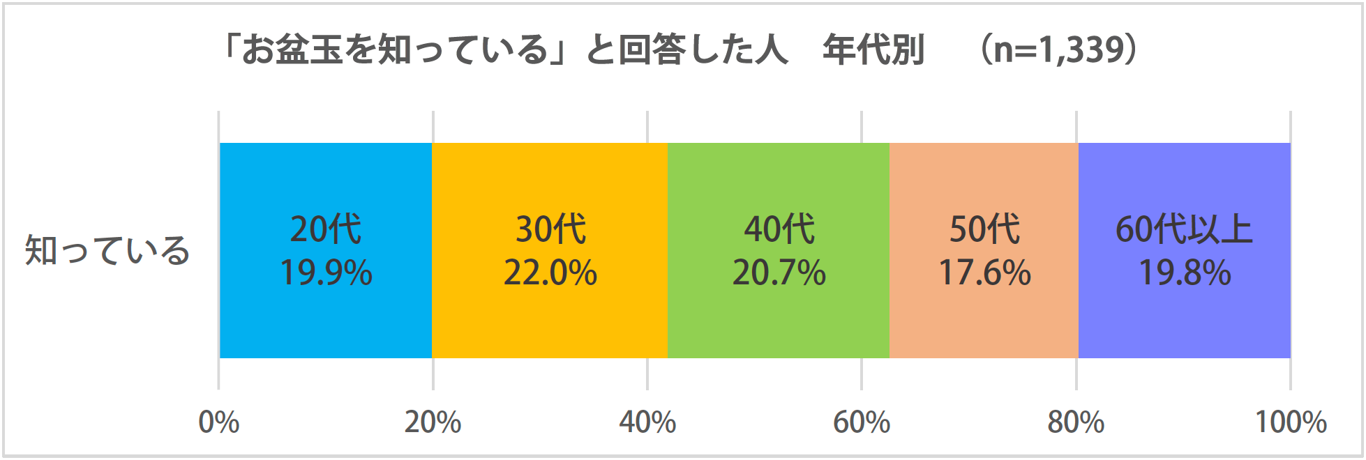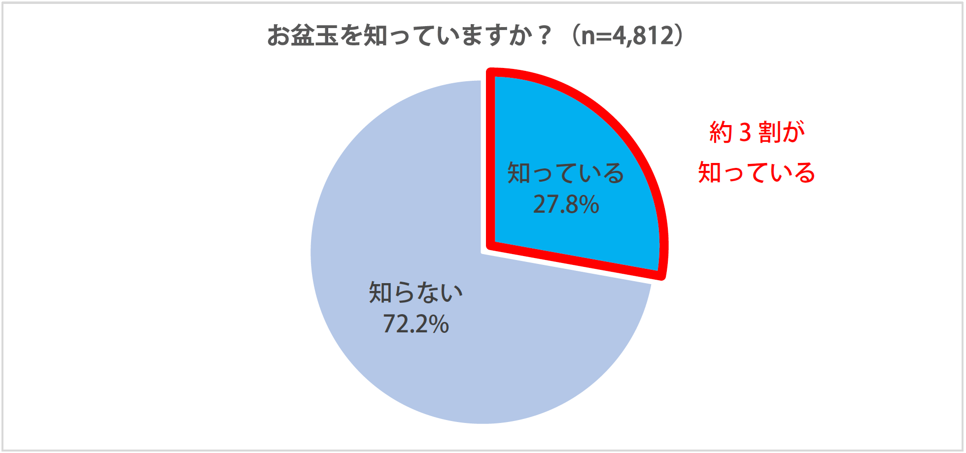 20代以上の男女4,812人を対象にした事前調査で「お盆玉を知っているか」の質問に対し回答は、「知っている」が27.8%、「知らない」が72.2%だった。「知っている」と回答した人を年代別で見ると30代が最多で22.0%、次いで40代が20.7%だった。男女別で見ると女性が53.7%、男性が46.3%だった。