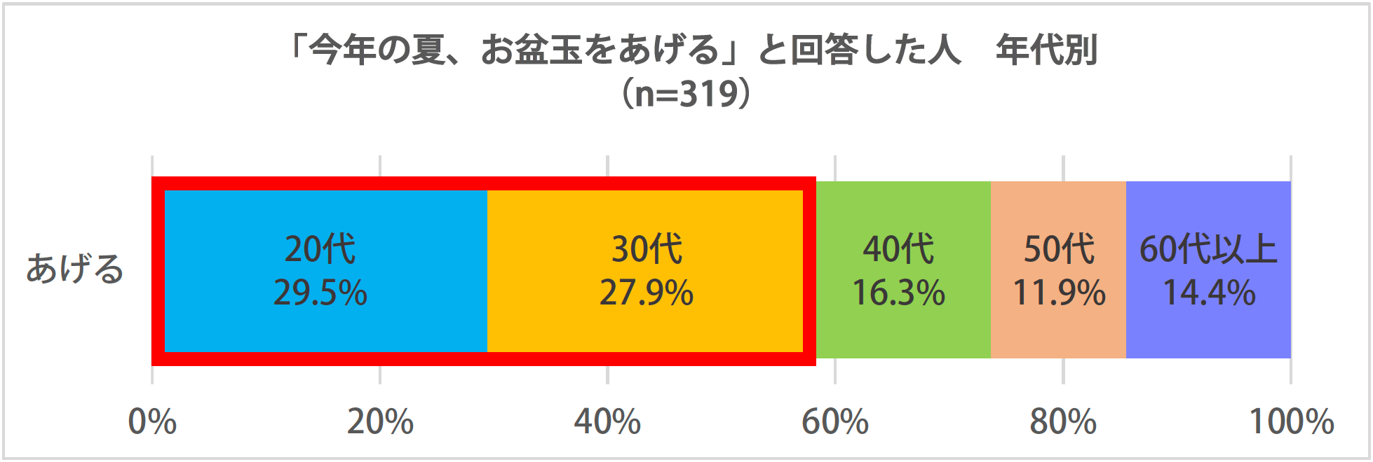 「お盆玉」の認知度は約3割で、そのうち4人に1人が今年の夏休みにお盆玉をあげることがわかりました。このことから、お盆玉は一定層に夏のコミュニケーションとして浸透していることが明らかになりました。お盆玉のやりとりは全年代で行われており、特に20代や30代の若者世代に多く親しまれていることから、今後も夏の風物詩としてより広がりを見せていくことが考えられます。