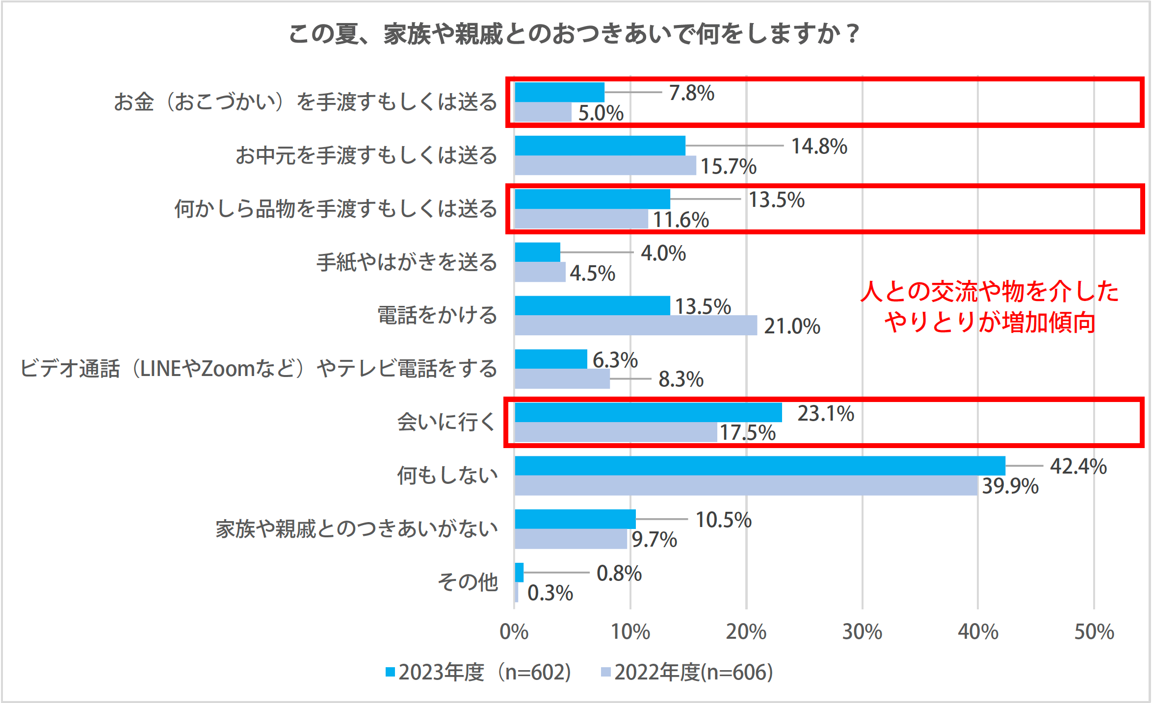 昨年の調査結果※2 と比較すると、「会いに行く」が5.6%増だったことから、今年は家族や親戚と対面する直接的な交流が増えることが明らかになった。また「何かしら品物を手渡すもしくは送る」が11.6%から1.9%増の13.5%、「お金を手渡すもしくは送る」が5.0%から2.8%増の7.8%で、家族や親戚とのおつきあいとして、物を介したやりとりが増加傾向にあることがわかった。